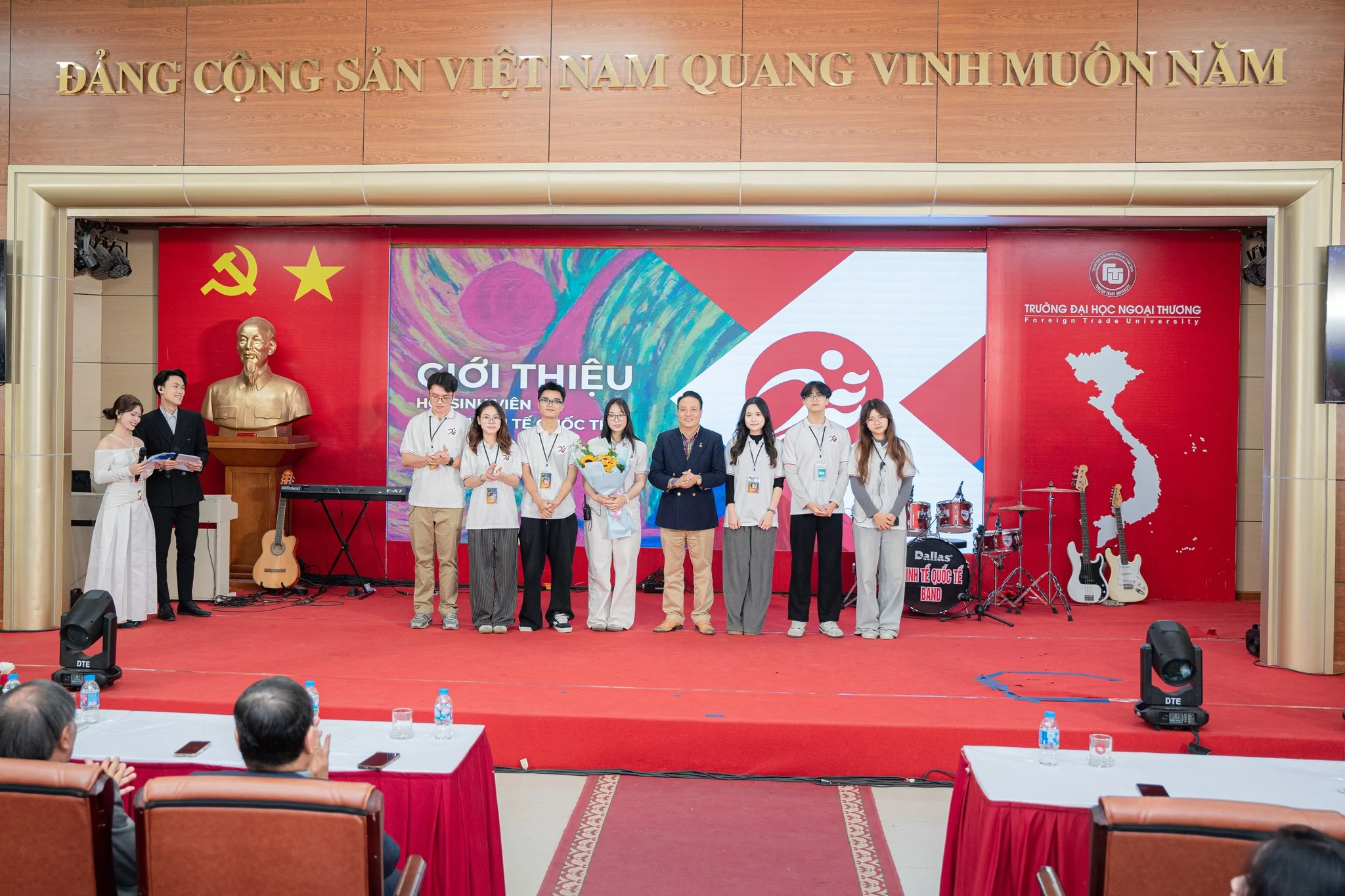 Tiếp nối chương trình, đại diện Khoa KTQT, PGS, TS Hoàng Xuân Bình – Trưởng khoa KTQT đã trao Kỷ niệm chương tri ân các nhà tài trợ của IE Shine 2025 gồm có Ông Hoàng Đình Nam – Giám đốc điều hành Công ty TNHH An Lợi; Ông Nguyễn Mạnh Cường – Chủ tịch, Giám đốc điều hành Công ty TNHH Tư vấn và Đầu Tư giáo dục Trí Cường; Ông Nguyễn Tùng Lâm – Giám đốc Công ty CP Công nghệ giáo dục Trường học trực tuyến Onschool. Sau đó, PGS, TS Hoàng Xuân Bình – Trưởng khoa KTQT cũng trao tặng hoa chúc mừng khoảnh khắc chính thức ra mắt Hội Sinh viên Kinh tế Quốc tế – một cộng đồng sinh viên được thành lập với mục tiêu kết nối và hỗ trợ nhau trong học tập, NCKH và các hoạt động sinh viên khác.
