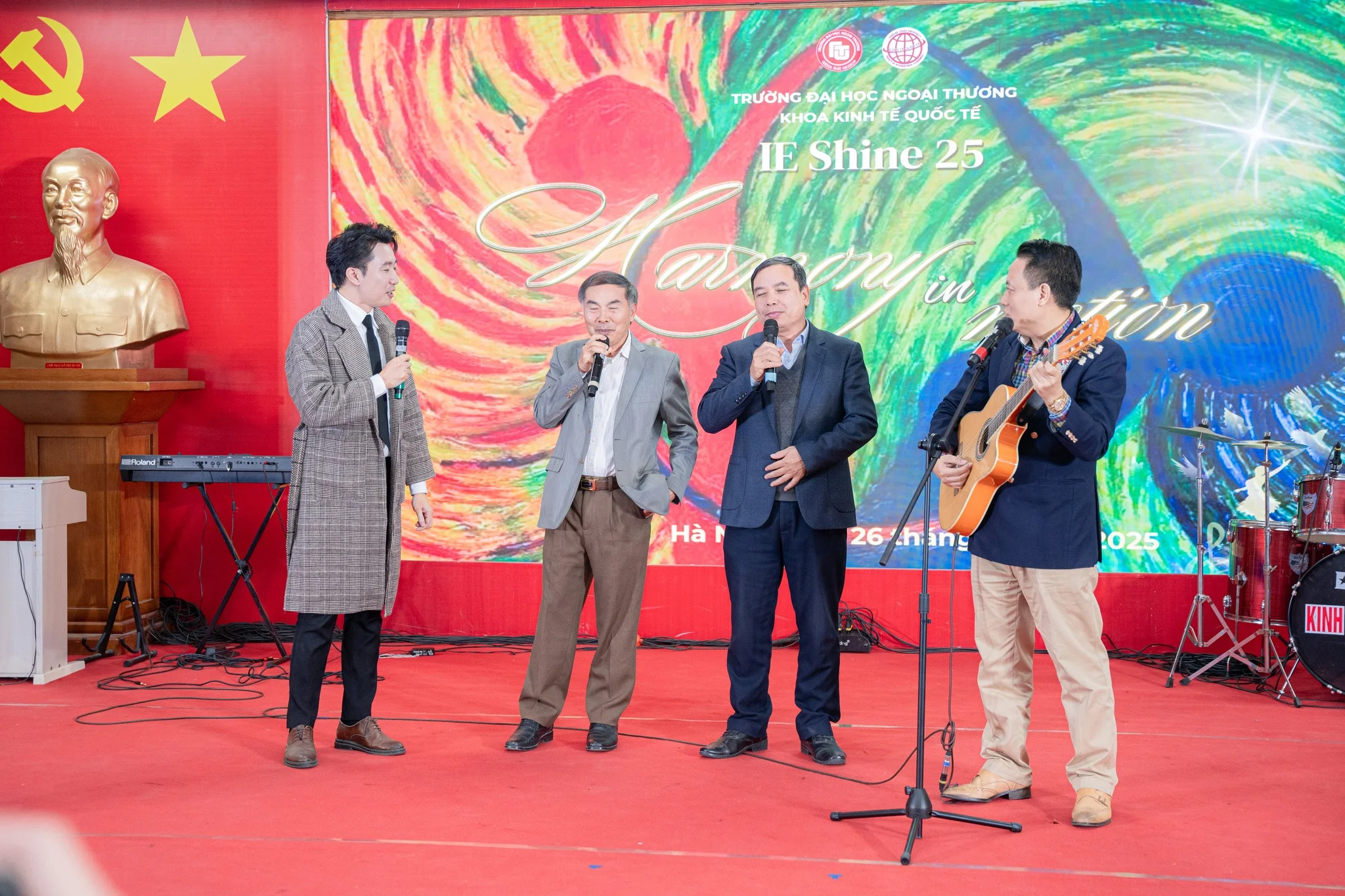 Tiếp theo đó, IE Shine 2025 “Harmony in Motion” đã chính thức bắt đầu cùng các tiết mục văn nghệ đặc sắc có sự kết nối giữa các phòng ban trong trường, lãnh đạo Khoa KTQT, giảng viên, NCS, sinh viên… Mỗi tiết mục đều được chuẩn bị công phu, với ý nghĩa sâu sắc và thể hiện tinh thần trẻ trung đầy nhiệt huyết. Điểm nhấn của Đêm hội IE Shine 2025 chính là tiết mục ngẫu hứng “Liên khúc mùa đông” được trình bày qua giọng hát và phần đệm guitar bởi PGS, TS Hoàng Xuân Bình – Trưởng khoa KTQT cùng PGS, TS Nguyễn Việt Khôi – Phó Hiệu trưởng Trường Khoa học liên ngành và Nghệ thuật, Đại học Quốc gia Hà Nội; TS Hoàng Tuấn Dũng – Giám đốc Trung tâm Hỗ trợ Sinh viên FSSC; PGS, TS Nguyễn Bình Dương – Giảng viên Khoa KTQT; Ông Nguyễn Mạnh Cường – Chủ tịch, Giám đốc điều hành Công ty TNHH Tư vấn và Đầu Tư giáo dục Trí Cường; Ông Nguyễn Tùng Lâm – Giám đốc Công ty CP Công nghệ giáo dục Trường học trực tuyến Onschool; ThS, NCS Lê Thanh Thùy Dương – Phó Trưởng khoa Tiếng Trung; ThS, NCS Đặng Hương Giang – Giảng viên Khoa Khoa học Chính trị và Nhân văn.